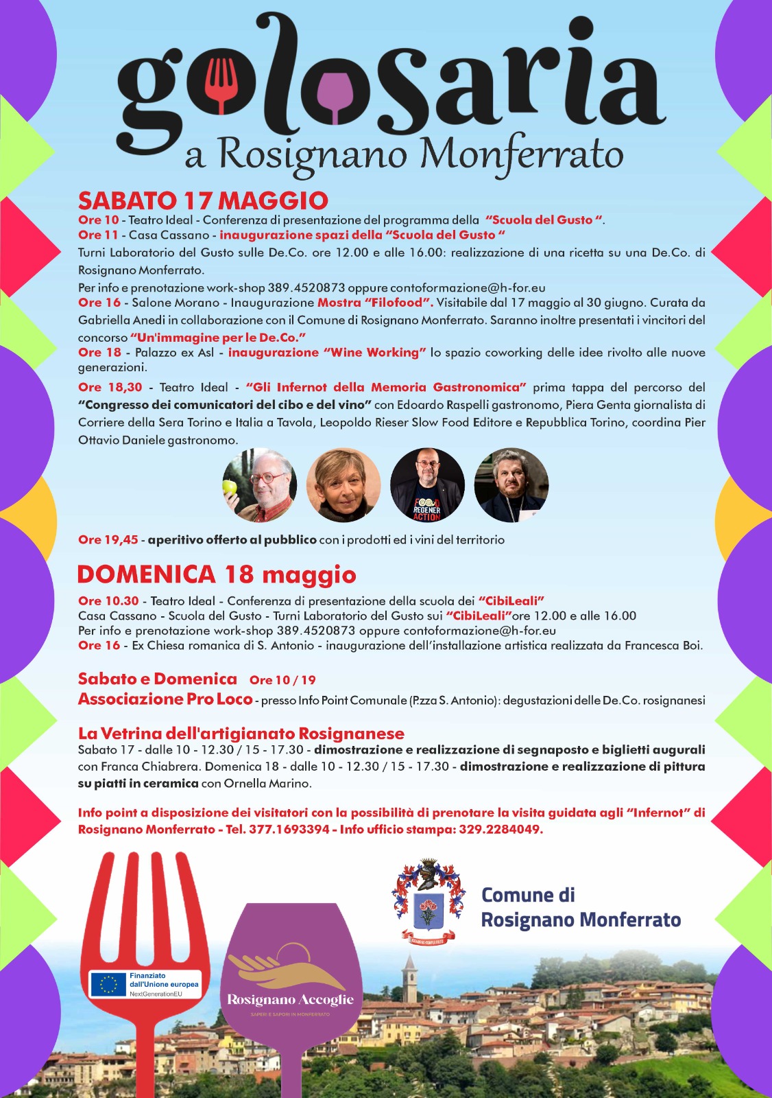 Il borgo di Rosignano Monferrato aderisce anche quest'anno alla manifestazione Golosaria Monferrato, che nel fine settimana di sabato 17 e domenica 18 maggio anima l'intero territorio. Il tema di questa edizione, la diciannovesima, è “I Colori del Monferrato”, fra arte, gusto e paesaggio: un omaggio alle infinite sfumature che rendono uniche queste colline.