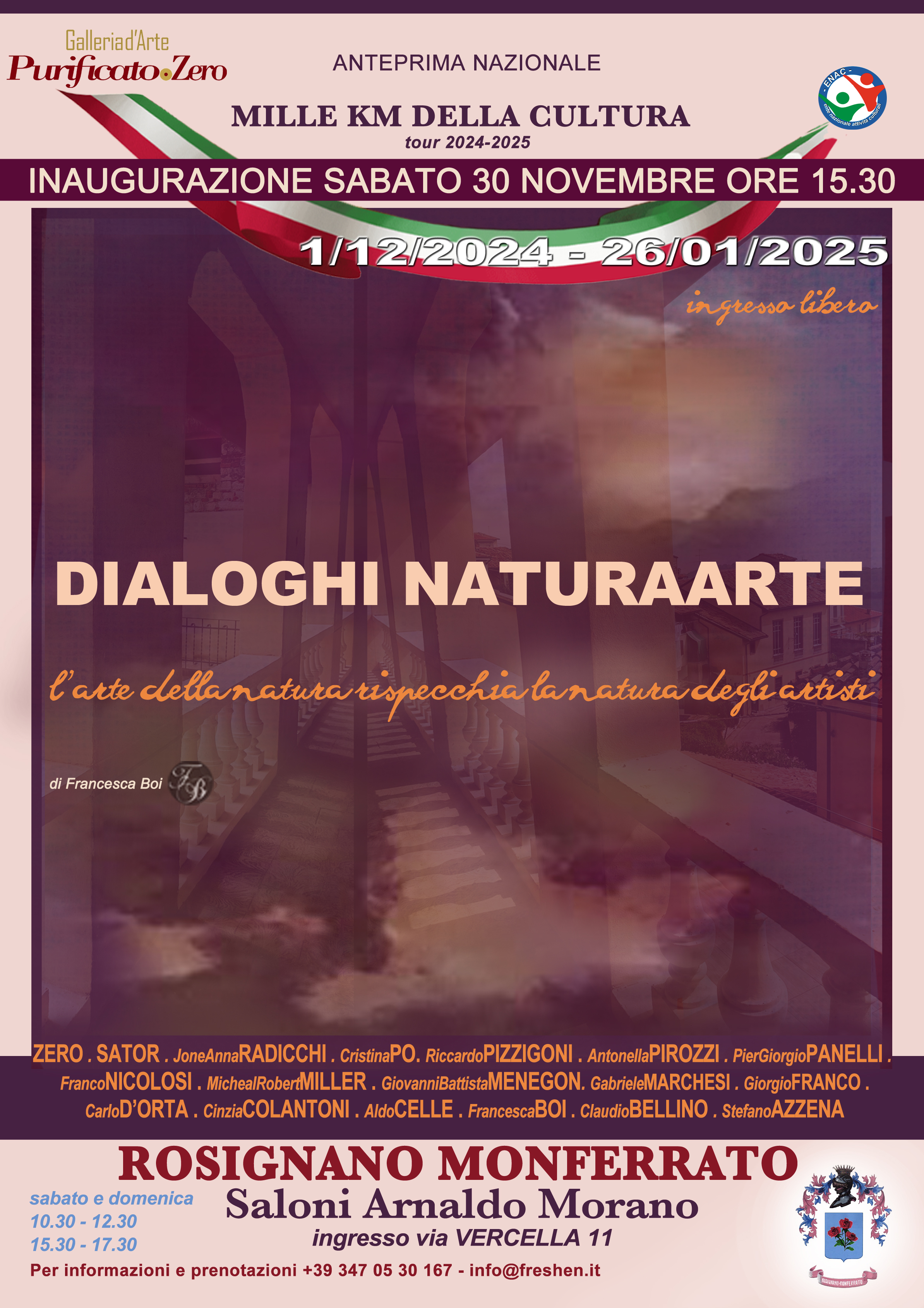 Sabato 30 novembre alle ore 15.30 diamo il benvenuto ai nuovi artisti, con opere in esposizione e vendita, ai Saloni Morano a Rosignano Monferrato. Un’anteprima nazionale della “Mille Km della Cultura” di grande successo, promossa dalla storica Galleria d’Arte Purificato.Zero, di Roma, in collaborazione con ENAC - Ente Nazionale Attività Culturali, la mostra d’arte contemporanea “DIALOGHI NATURAARTE” è un progetto di Francesca Boi, artista visiva e curatrice.
