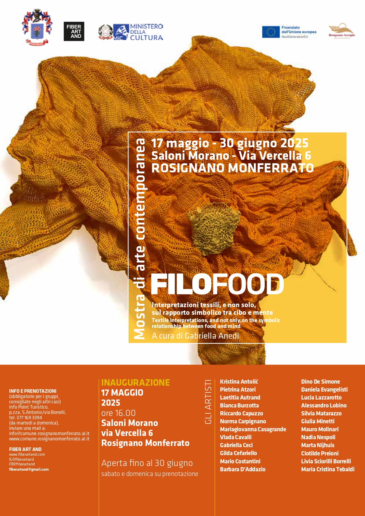 Cibo e arte si intrecciano in un dialogo sorprendente nella mostra "Filo Food", curata da Gabriella Anedi - Fiber Art And in collaborazione con il Comune di Rosignano Monferrato. Un’esposizione originale che invita a riflettere sul nostro rapporto con il cibo attraverso una selezione di opere tessili, fotografie e ceramiche, tutte accomunate da un unico, gustoso filo conduttore.