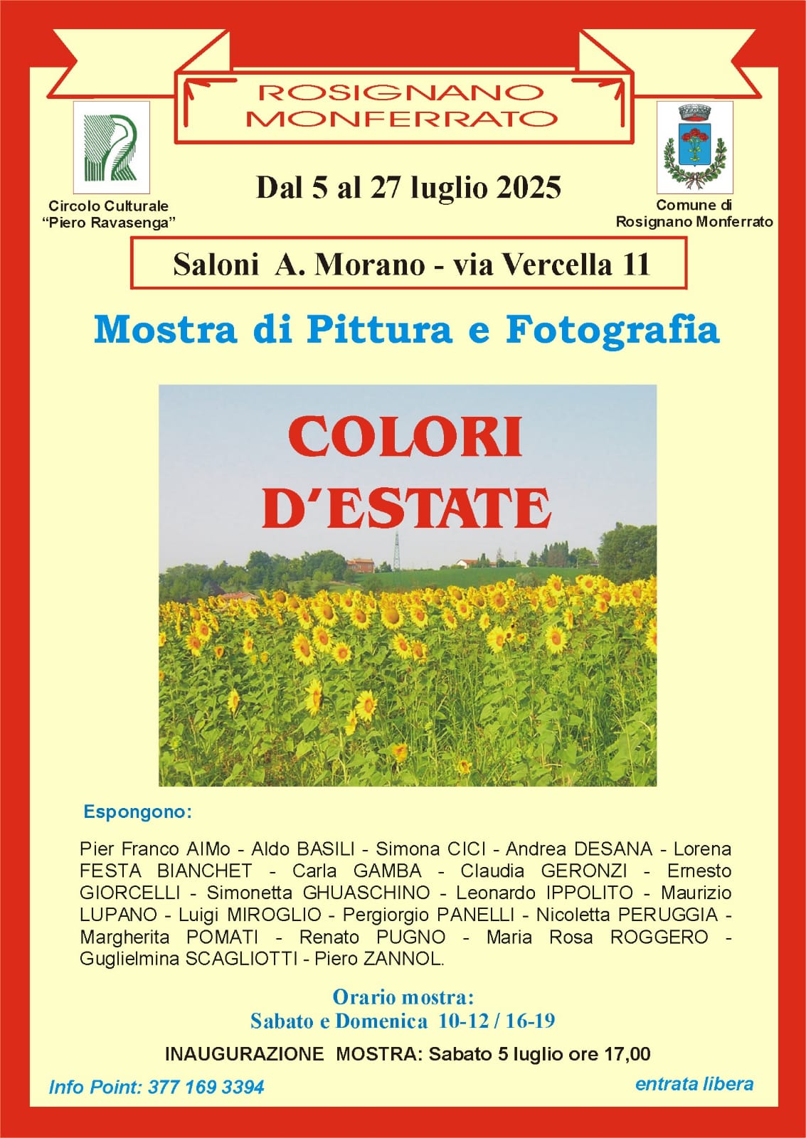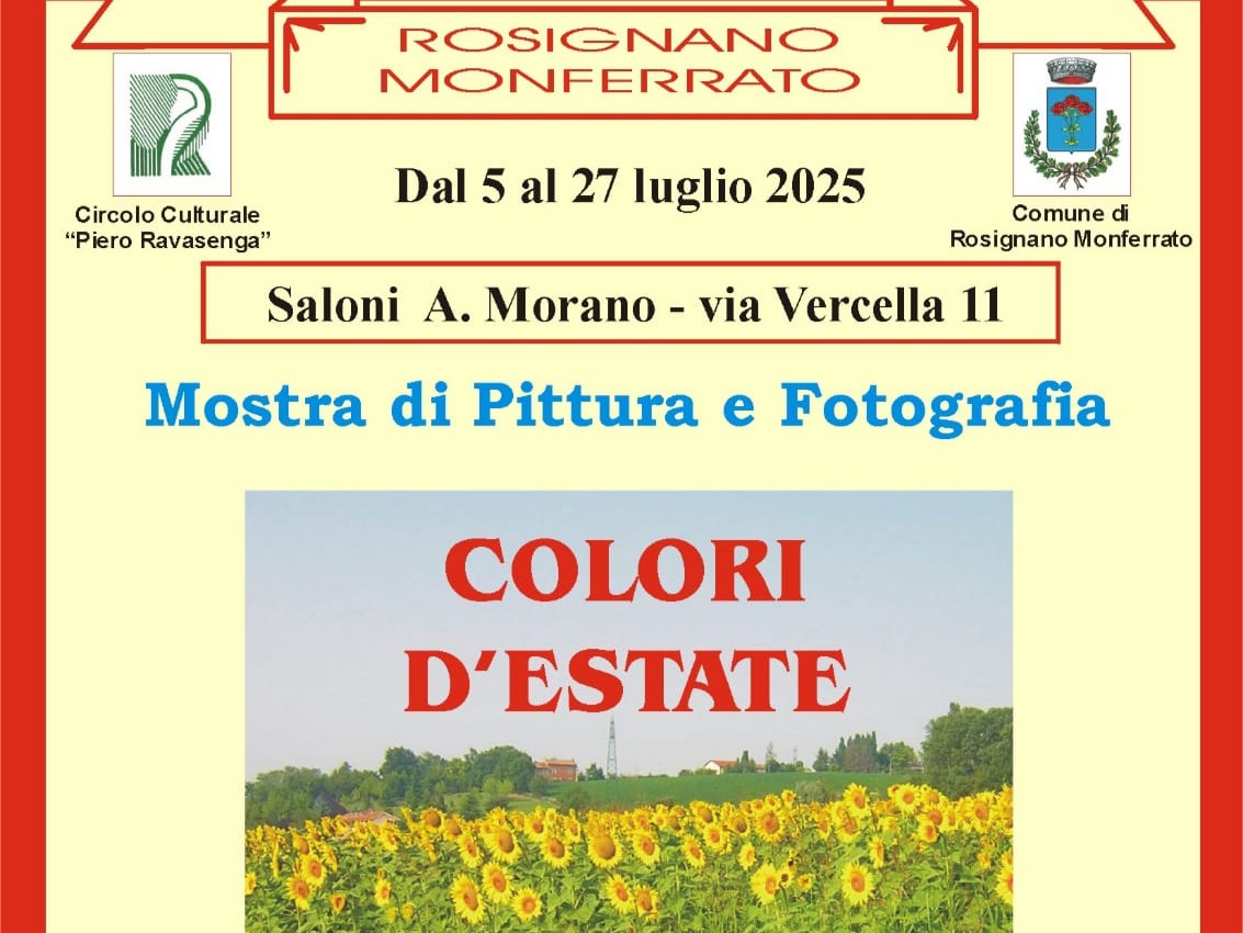 Per tutti i sabati e domeniche di luglio, il Circolo Culturale Piero Ravasenga, con il patrocinio e la collaborazione del Comune di Rosignano Monferrato, presenterà una collettiva di pittura e fotografia proposta da diciannove dei propri artisti dal titolo “Colori d’estate” che si terrà all’interno dei Saloni Polivalenti Arnaldo Morano, in via Vercella 11 a Rosignano Monferrato. I Saloni ospitano anche, in mostra permanente, la ricostruzione della bottega del famoso liutaio Arnaldo Morano, riconosciuto tra i più importanti nel panorama della liuteria mondiale.