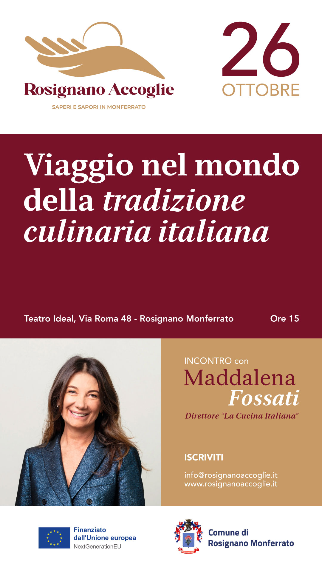L’appuntamento inaugurale sarà sabato 26 ottobre alle ore 15 presso il Teatro Ideal, quando avremo l’onore di ospitare Maddalena Fossati, direttrice del prestigioso mensile La Cucina Italiana. Durante questo incontro, Maddalena ci condurrà attraverso un affascinante viaggio nel mondo della tradizione culinaria italiana, spiegando l’importanza di preservare le nostre ricette e di tramandarle con cura. Un’occasione speciale per riflettere sul valore delle tradizioni gastronomiche del Monferrato e sul ruolo che ognuno di noi può giocare nella loro conservazione.