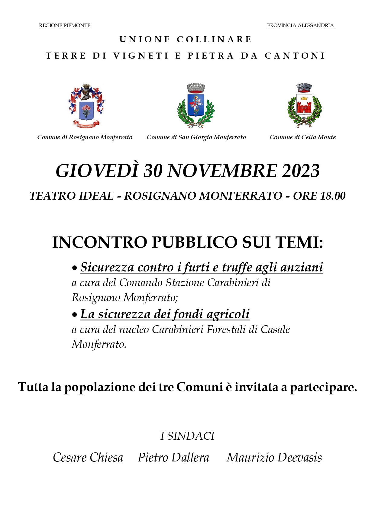 Rammentiamo l'incontro con la Stazione dei Carabinieri di Rosignano - giovedi' 30 novembre alle ore 18 presso il Teatro Ideal - come da Locandina allegata : un momento importante per porre domande e avere riscontri utili alla sicuerezza individuale e comunitaria.
