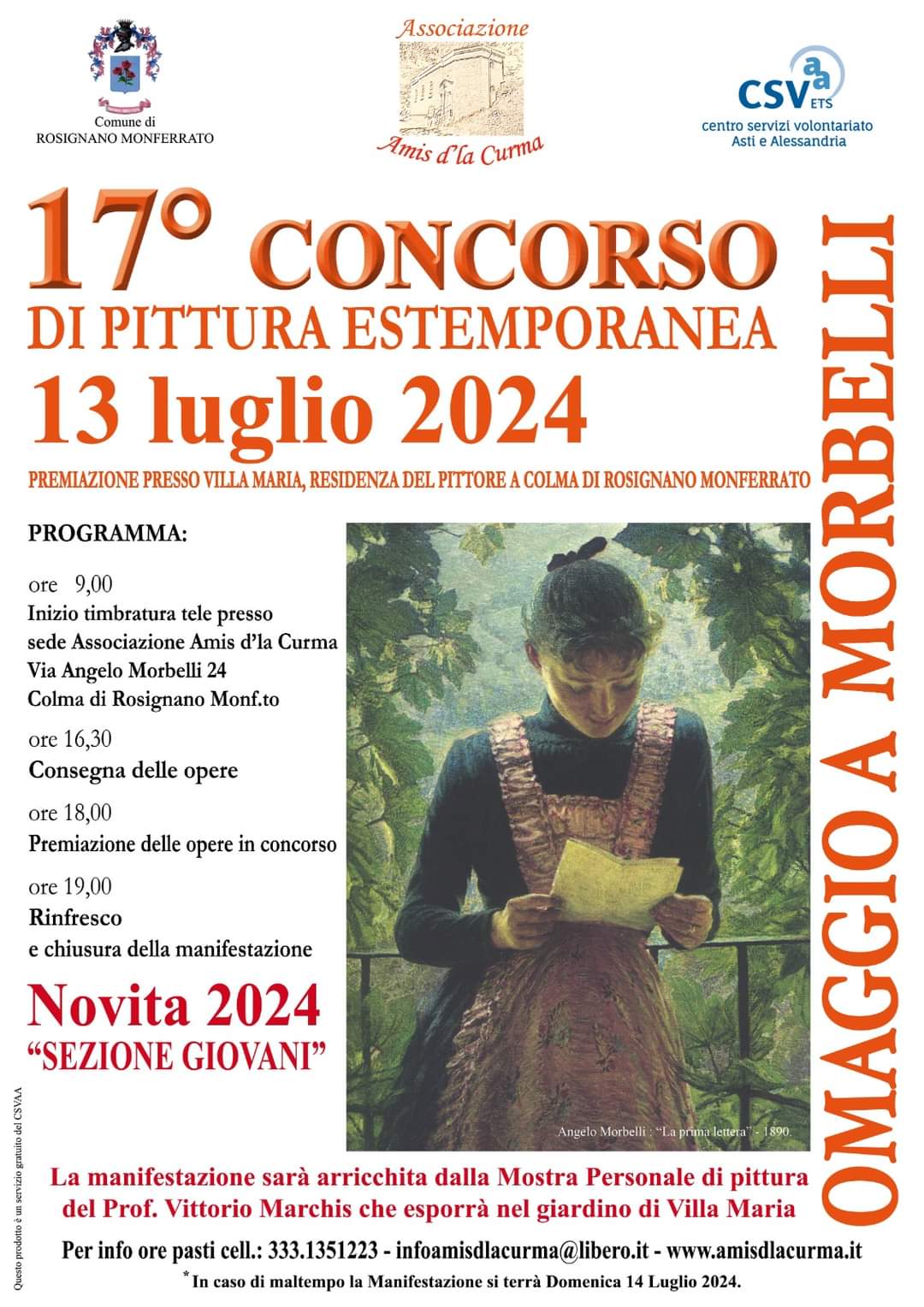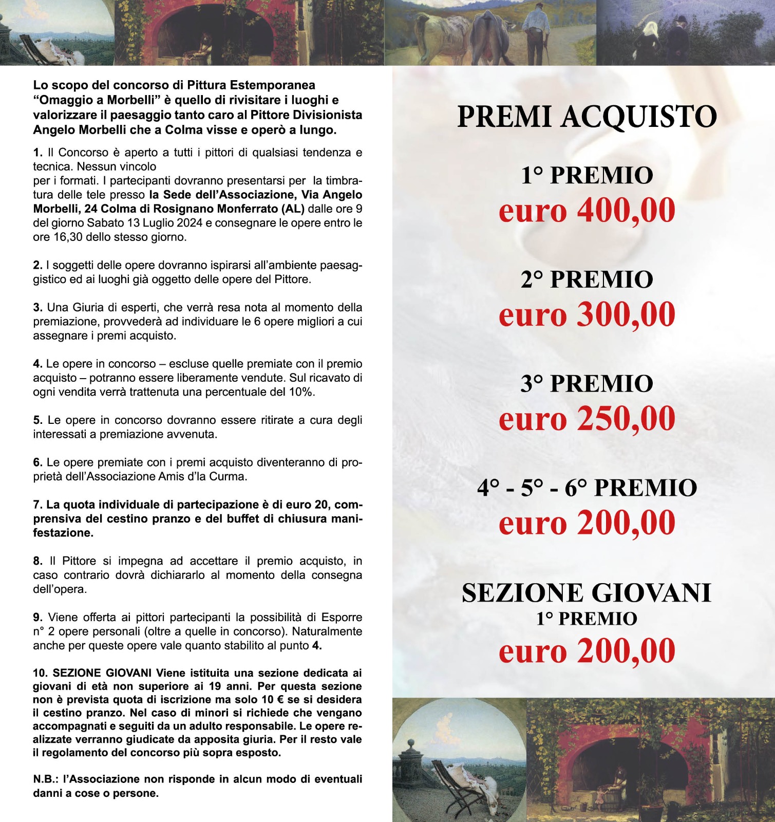 Sabato 13 luglio torna il Concorso di Pittura Estemporanea "Omaggio a Morbelli", il cui scopo è quello di rivisitare i luoghi e valorizzare il paesaggio tanto caro al Pittore Divisionista Angelo Morbelli che a Colma visse ed operò a lungo.
