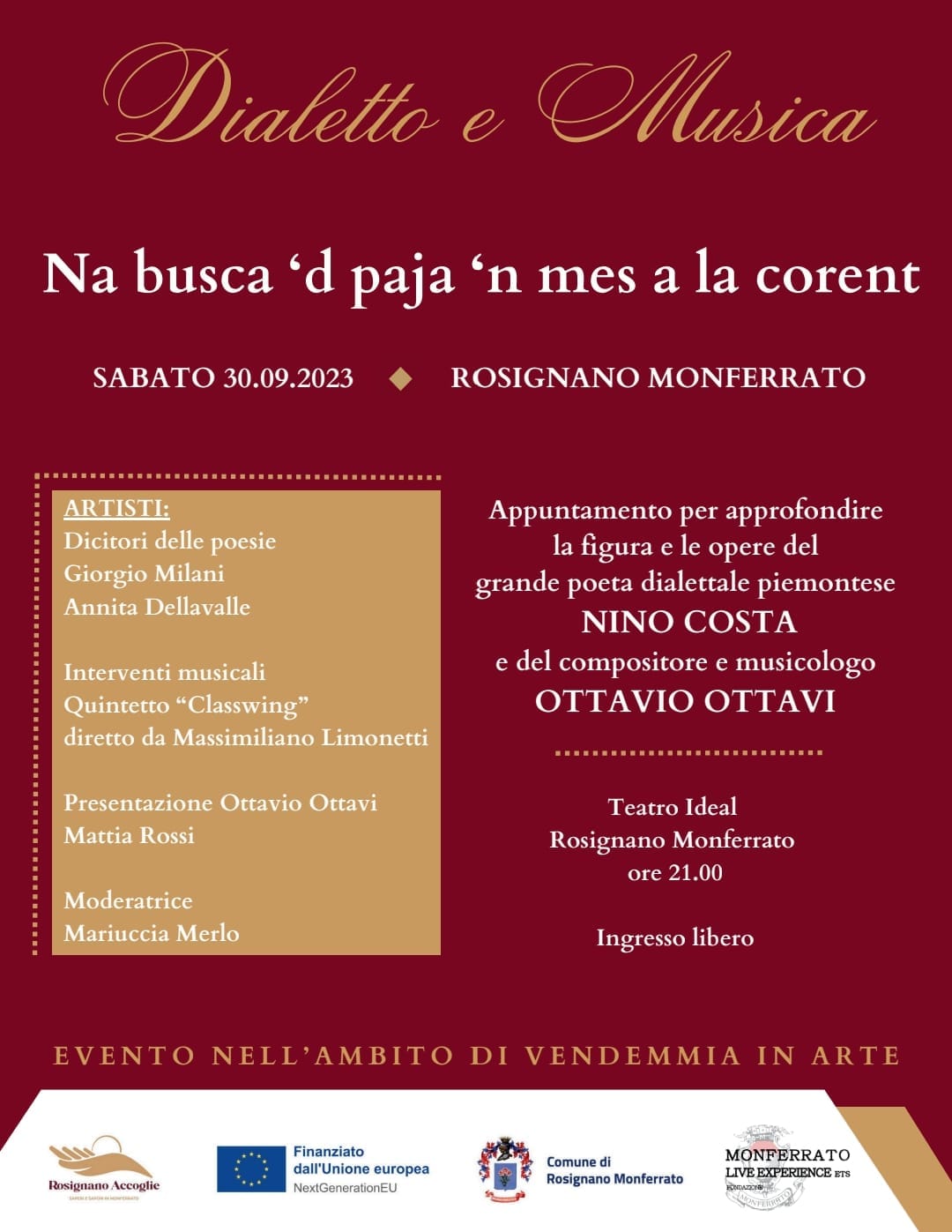 Sempre sabato 30 settembre, alle 21:00, si terrà invece l’incontro-spettacolo sulla figura di Nino Costa, uno dei più grandi (se non il più grande) poeta dialettale piemontese di tutti i tempi, nato a Torino nel 1886 e scomparso nella stessa città nel 1945. La serata si aprirà con la presentazione e l’inquadramento storico del poeta a cura della prof.ssa Mariuccia Merlo. A seguire, lettura ed interpretazione di Giorgio Milani e Annita Dellavalle delle più significative poesie di Nino Costa, tratte dal libro "Tornand. 200 poesie piemontesi ignorate”, con intermezzi musicali da parte del quintetto Classwing - flauto traverso, tromba, trombone, basso tuba, clarinetto - diretto dal maestro Massimiliano Limonetti. In chiusura, in occasione dei 130 anni dalla scomparsa di Ottavio Ottavi, il critico musicale Mattia Rossi illustrerà l’attività del compositore e musicologo.