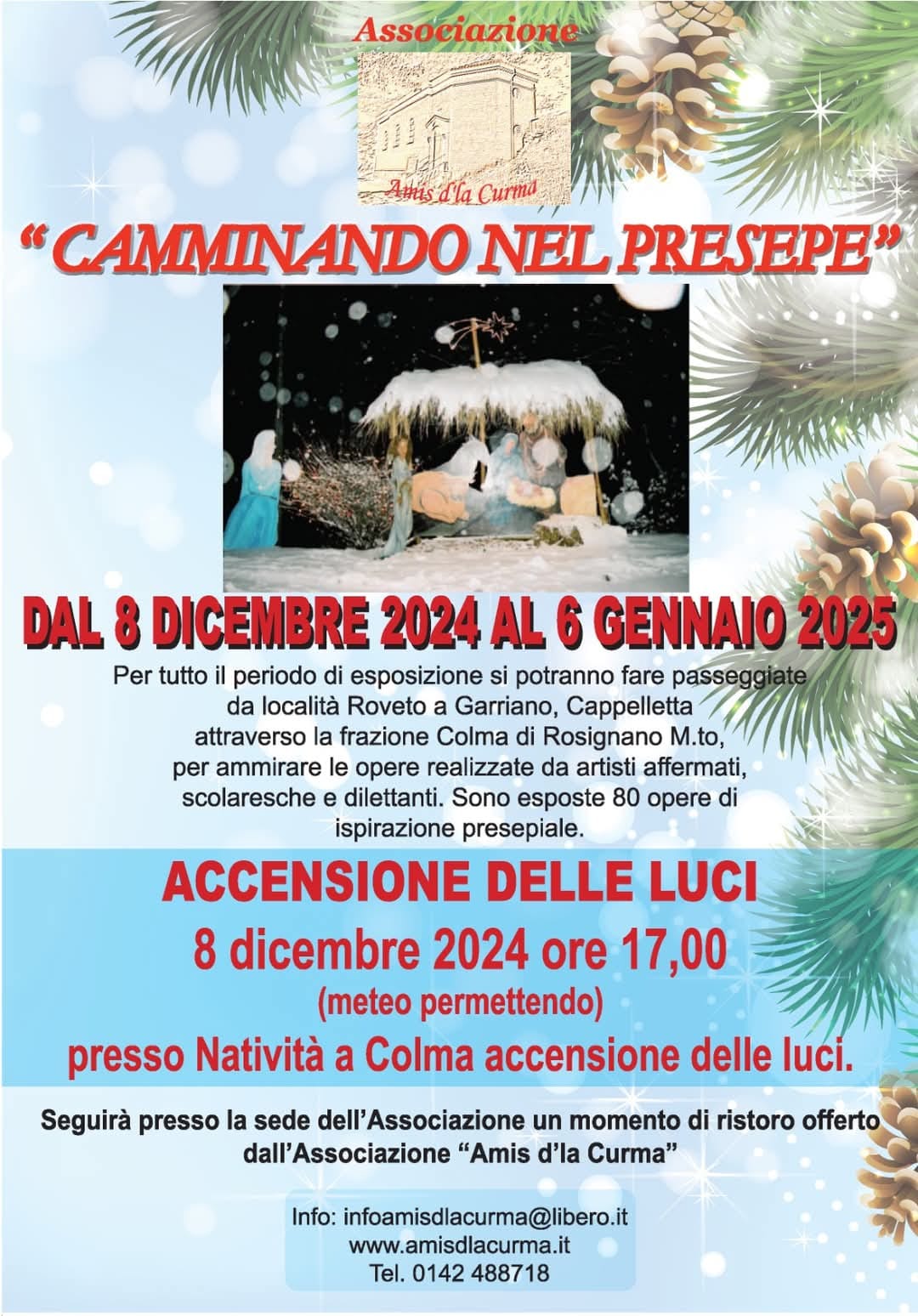 Lungo le vie delle frazioni di Colma e Garriano e delle località limitrofe di Roveto e Cappelletta si dipana un suggestivo percorso pittorico dedicato ad una mirabile e variegata interpretazione artistica del Presepe. Particolarmente affascinante la visione notturna delle opere illuminate. Le installazioni - 80 complessivamente, realizzate con tecniche diversificate - sono collocate all'esterno, sempre fruibili. Organizzato dall’Associazione Amis d’la Curma.