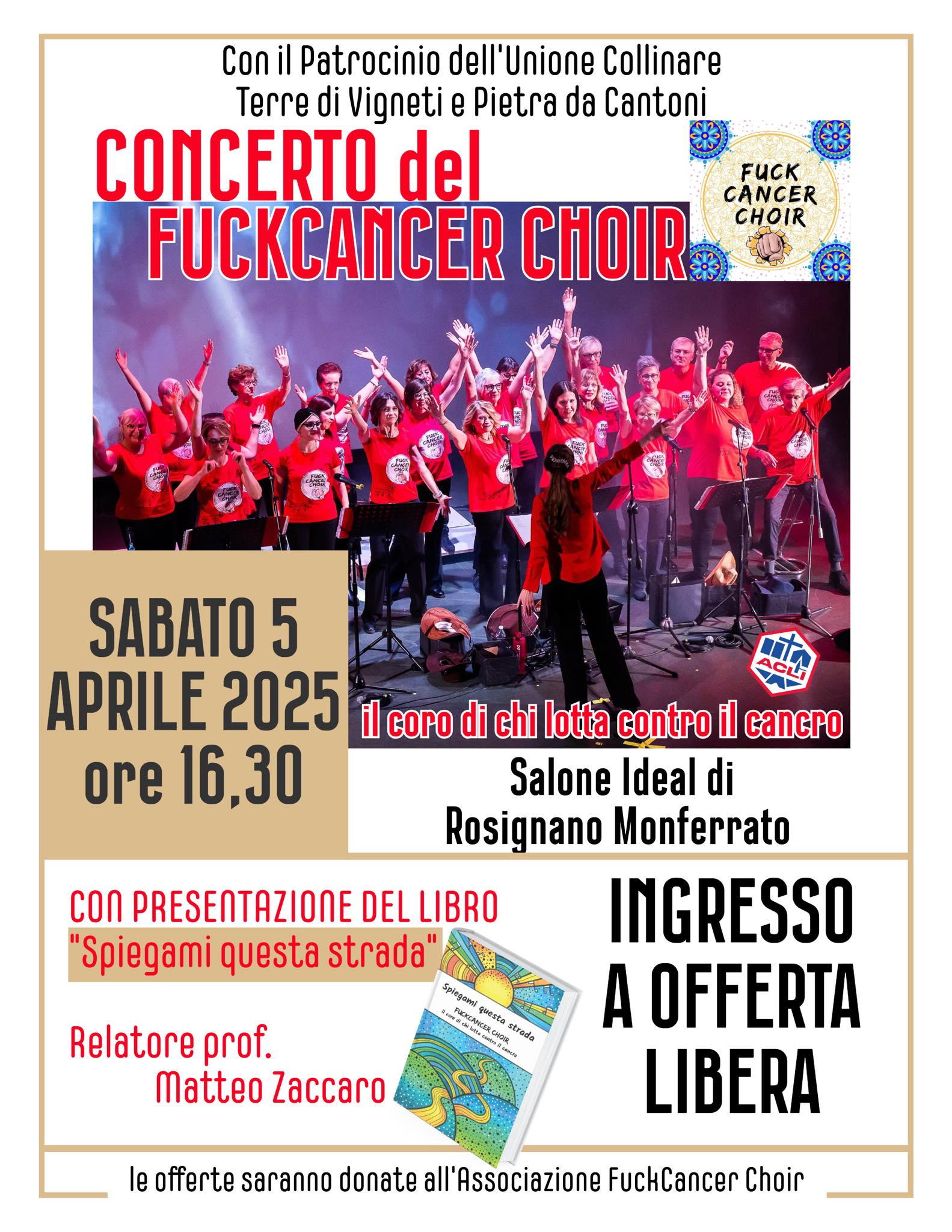 Sabato 5 aprile alle ore 16.30 presso il Salone Ideal di Rosignano Monferrato si terrà un evento di grande significato emotivo e sociale: il concerto del FuckCancer Choir, il coro di chi lotta contro il cancro. Un pomeriggio all’insegna della forza e della capacità di reagire: questo il messaggio che il coro intende trasmettere attraverso la propria musica, trasformando il dolore e la sofferenza in una potente forza collettiva capace di portare speranza, solidarietà e sostegno concreto.