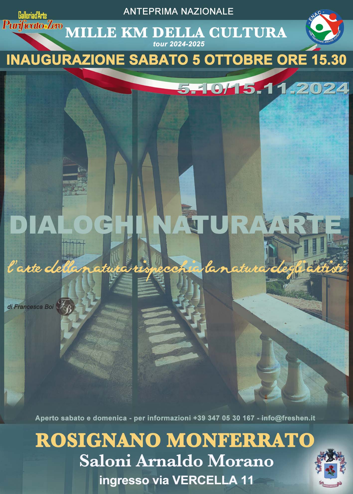 La mostra è l’anteprima nazionale della “Mille Km della Cultura” promossa dalla storica Galleria d’Arte Purificato.Zero, di Roma, in collaborazione con ENAC (Ente Nazionale Attività Culturali). L’esposizione sottolinea come la natura e gli artisti si accostino dialogando, dando forma a una più intima espressione, e così dare inizio ad una relazione in un contesto collettivo per poter innescare nuove modalità di comunicazione e relazionali tra natura e umanità e occasione.