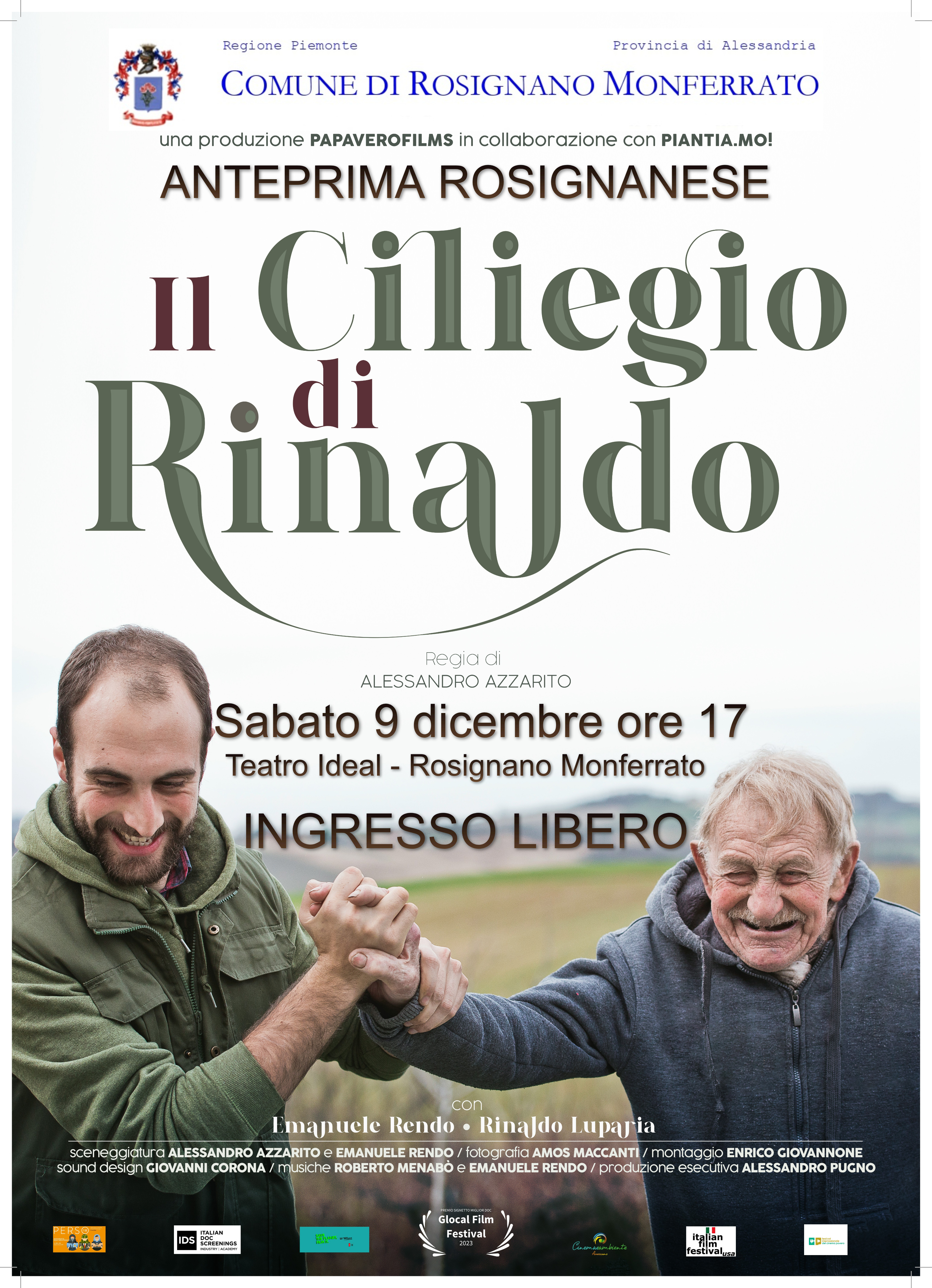 Sabato 9 dicembre, alle ore 17 presso il Teatro Ideal , avrà luogo la tanto attesa proiezione in "anteprima locale" del docu-film "Il Ciliegio di Rinaldo": esso torna idealmente a casa, nella sua terra di origine.