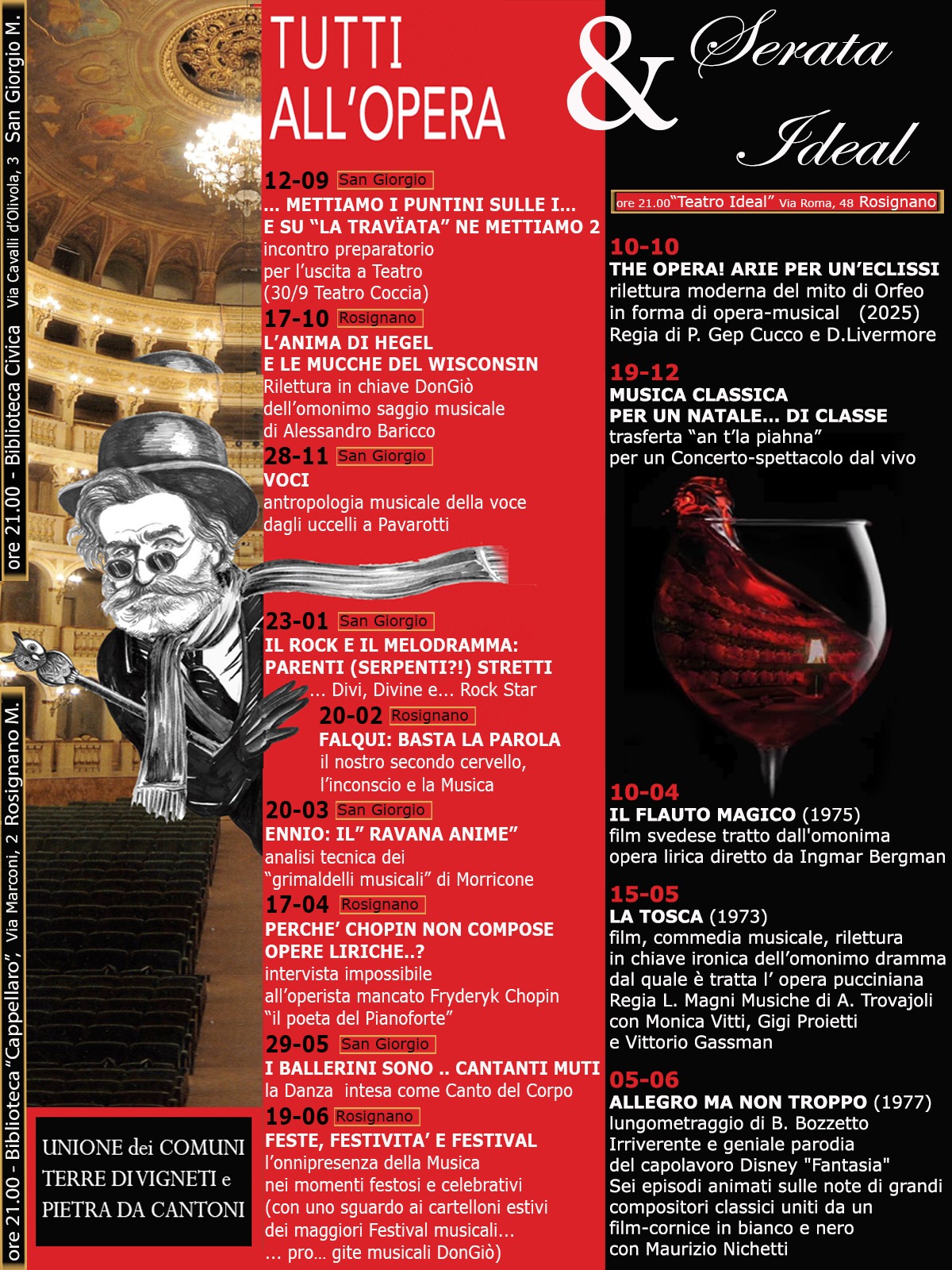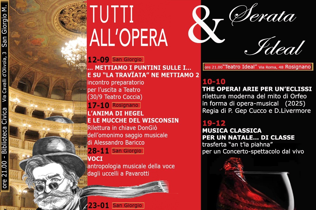 La rassegna "Tutti all'Opera" si tiene alle ore 21 presso la Biblioteca "Cappellaro" di Rosignano Monferrato (via Marconi, 2) oppure la Biblioteca Civica di San Giorgio Monferrato (via Cavalli d'Olivola, 3) nel periodo settembre 2025 - giugno 2026 secondo il calendario seguente (per maggiori informazioni si rimanda alla locandina allegata):