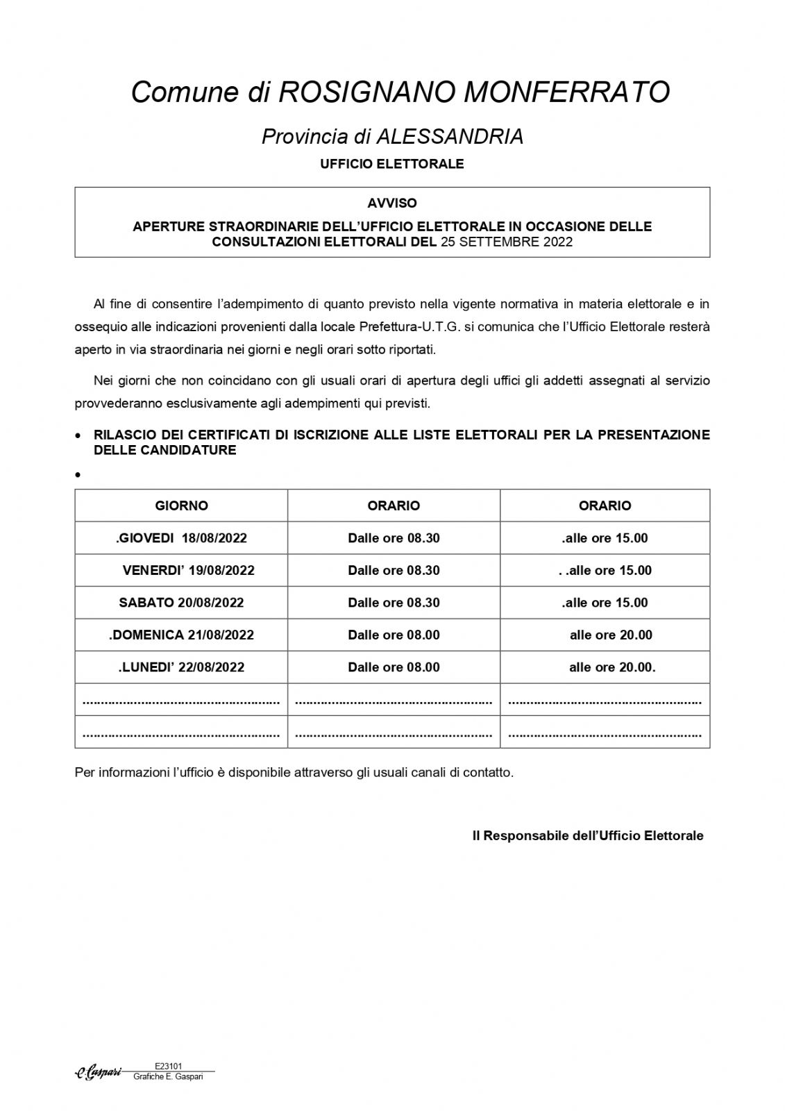 Aperture straordinarie dell'ufficio elettorale in occasione delle consultazioni elettorali del 25 settembre 2022 al solo fine del rilascio dei certificati di iscrizione alle liste elettorali per la presentazione delle candidature.