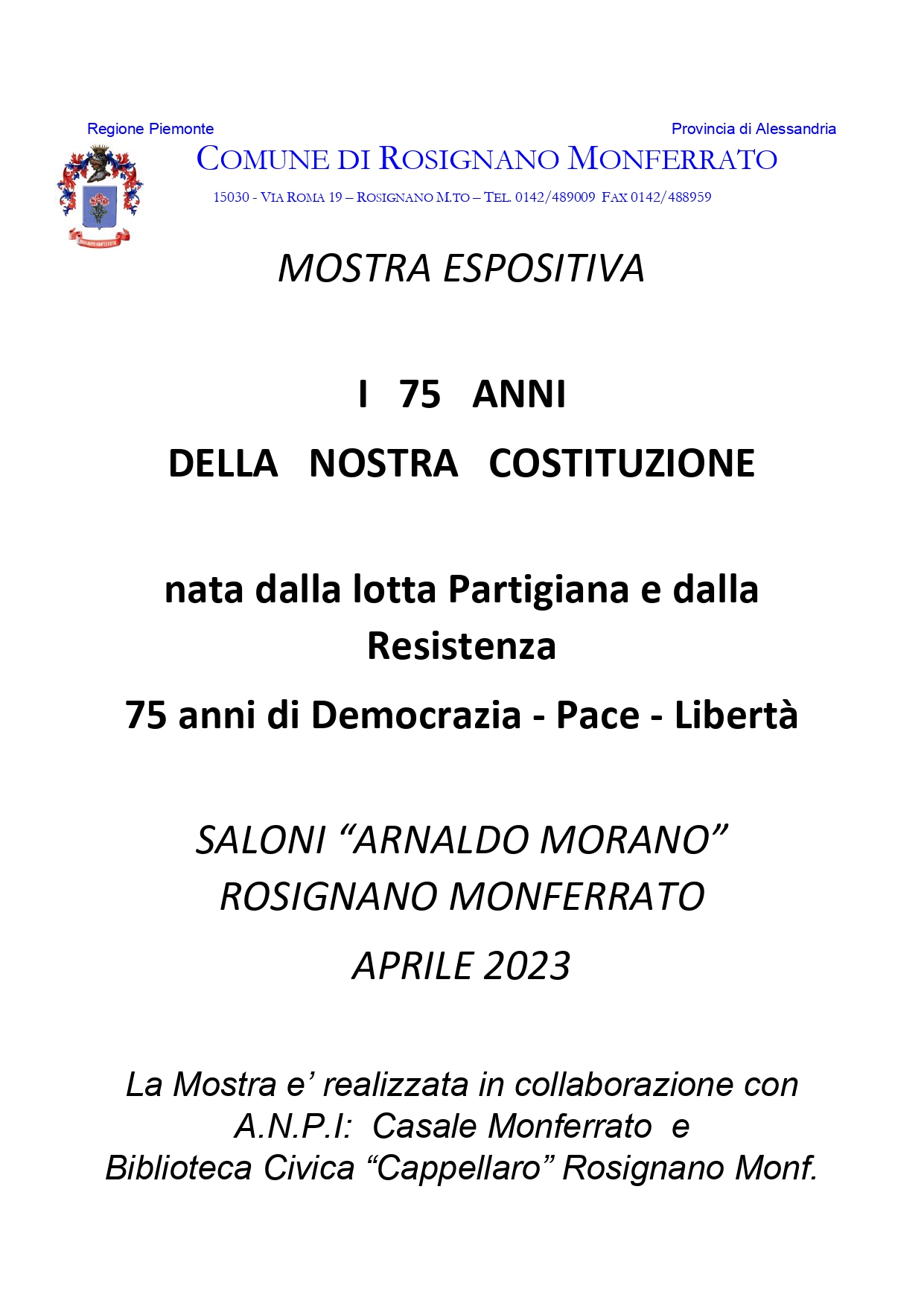 I 75 ANNI DELLA NOSTRA COSTITUZIONE - In occasione del 75^ Anniversario dell'entrata in vigore della Carta Costituzionale (1 gennaio 1948) e con l'approssimarsi della Festa della Liberazione, il prossimo 25 aprile, il Comune di Rosignano Monferrato in collaborazione con la nostra Biblioteca Cvica e con la Sezione Anpi di Casale Monferrato, ha predisposto alcune inziative che si svilupperanno nel corso delle prossime settimane