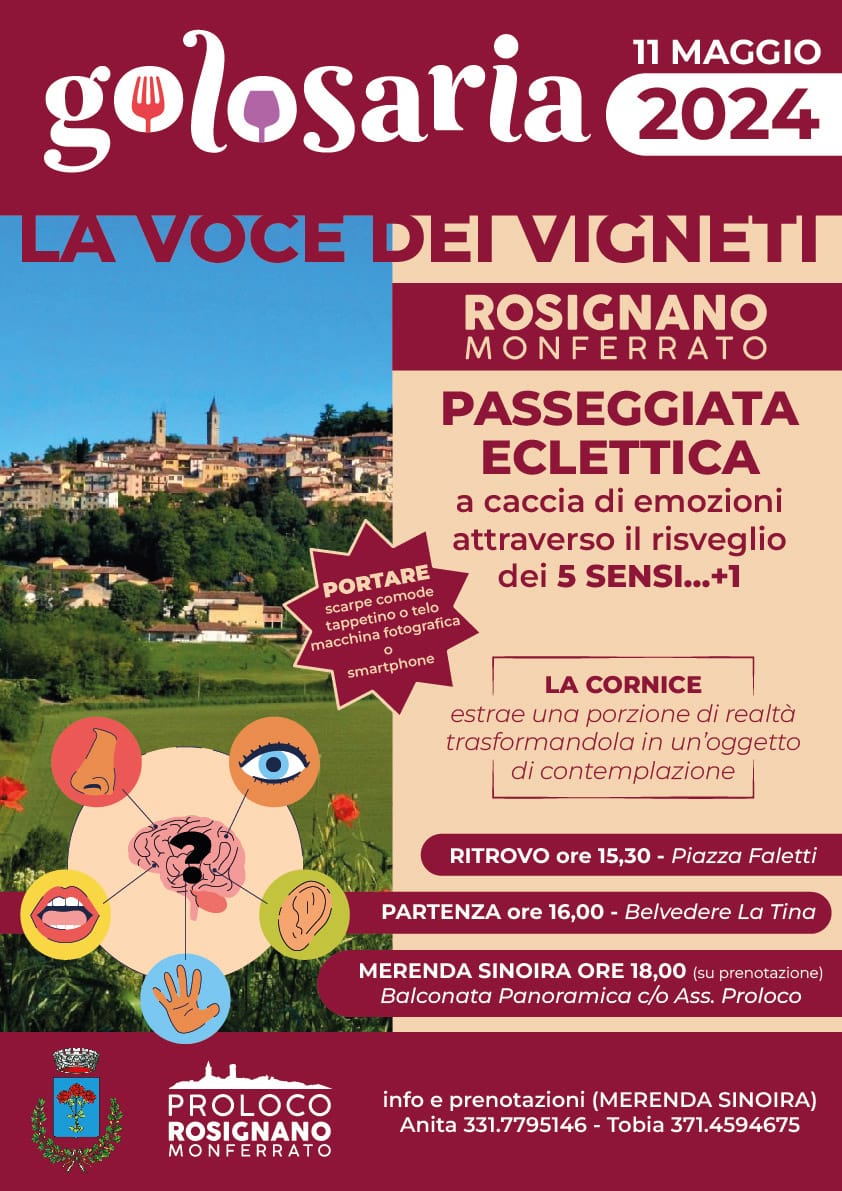 Nell'ambito delle attività nel prossimo fine settimana di "Golosaria in Monferrato", il Comune di Rosignano Monferrato organizza, in particolare, un evento unico nel suo genere: "La Voce dei Vigneti", una passeggiata a caccia di emozioni attraverso il risveglio dei 5(+1) sensi nei meravigliosi luoghi che circondano la rocca Rosignanese. L'appuntamento è per sabato 11 maggio alle ore 15:30 nel comodo parcheggio di Piazza Faletti, nel centro storico: la partenza ufficiale alle ore 16 , avviandosi dal pittoresco belvedere de "La Tina" dinanzi alla Stele artistica che racconta le ere geologiche del Territorio, ai piedi del Castello.