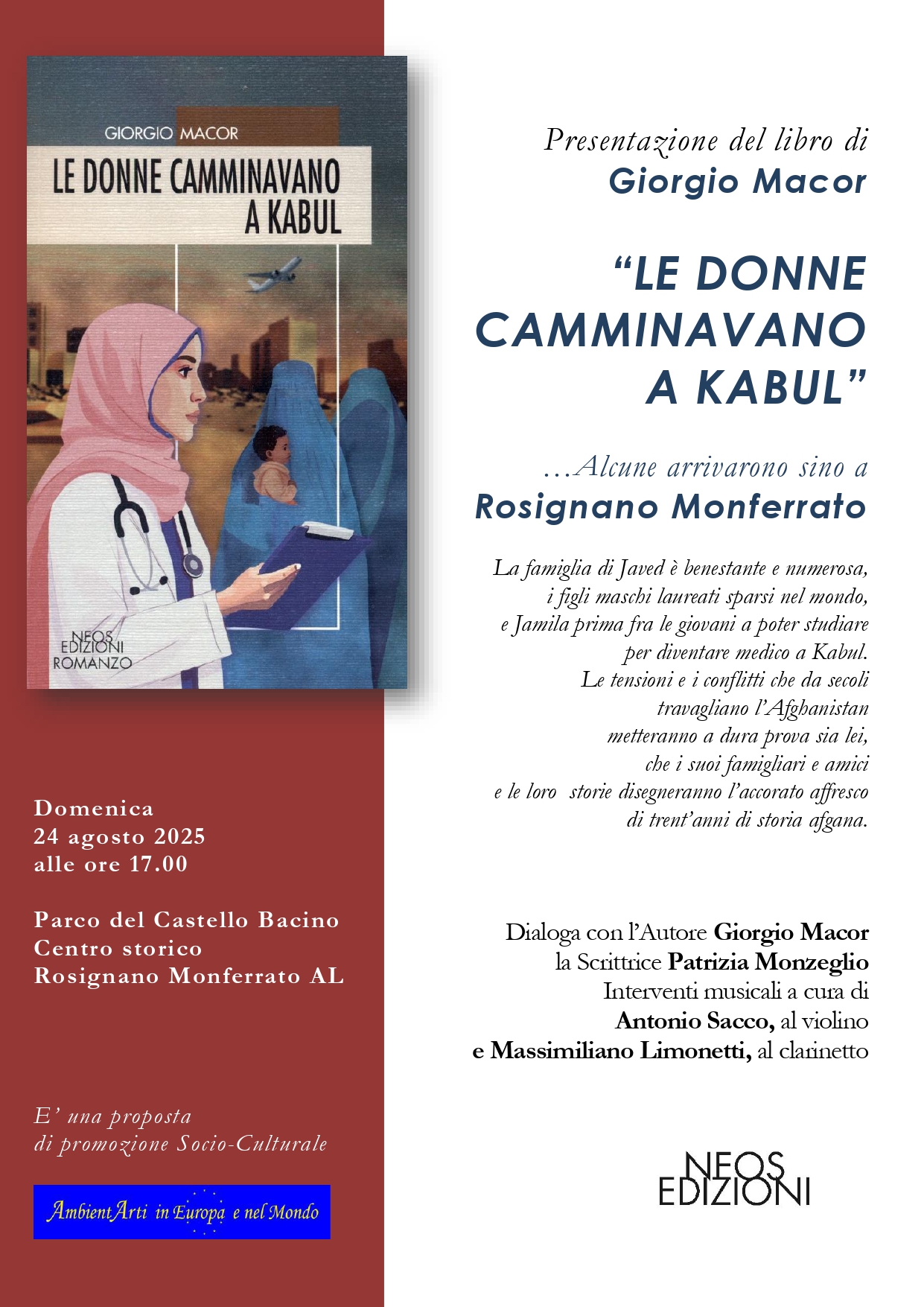 Nella fresca e fascinosa cornice del Parco del Castello Bacino, alla sommità della Rocca Rosignanese, la presentazione libraria sarà piacevolmente inframezzata da alcuni interventi musicali a cura del Duo Viol - Clar di Antonio Sacco, al violino e Massimiliano Limonetti, al clarinetto basso. I due strumentisti iniziano a collaborare nel 1994 in spettacoli teatrali nel Monferrato Casalese per proseguire negli anni a far parte di svariate formazioni fino alle orchestre da camera e sinfoniche affrontando vari generi musicali, dal medioevo ai giorni nostri, con tournee in Italia e all'estero. Il tema scelto dai due celebri musicisti per intrattenere nel corso della presentazione libraria il pubblico presente, è quello della “Donna” che sarà raccontata e celebrata attraverso melodie celebri e brani musicali noti. Il programma prevede una serie di brani del '900, a partire dagli anni '30, riarrangiati per questa piccola e semplice formazione, caratterizzata dalla melodia affidata al violino e l'accompagnamento ritmico-armonico al clarinetto basso.