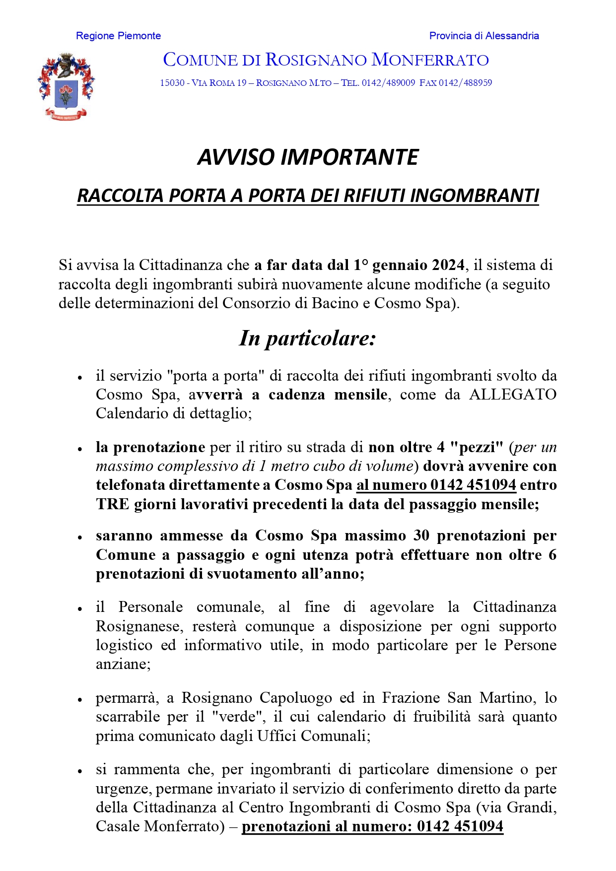 si prega di prendere visione dell'avviso allegato con le nuove modalità per la raccolta ingrombranti PORTA A PORTA a partire dal 01/01/2024.