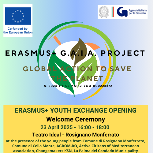 siamo lieti di invitarvi all'evento di Welcome Ceremony che si terrà mercoledì 23 aprile 2025 dalle ore 16:00 alle ore 18:00 presso il Teatro Ideal - Rosignano Monferrato per accogliere i giovani ragazzi che parteciperanno dal 23 al 30 aprile al progetto GLOBAL ACTION TO SAVE THE PLANET – G.A.I.A.” project Erasmus+ 2021-2027 Program - Key Action 1 Mobility - Youth Exchange Ref N. 2024-1-IT03-KA152-YOU-000228372.