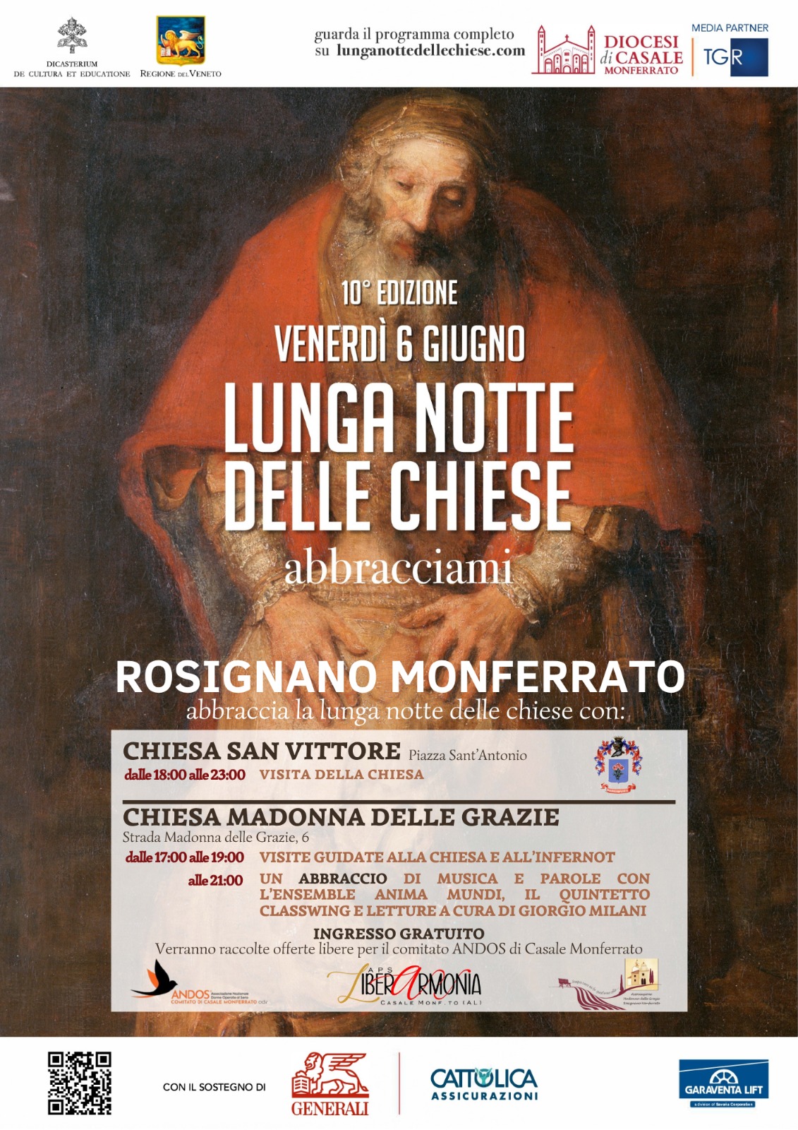 - Chiesa Madonna delle Grazie (strada Madonna delle Grazie, 6), aperta dalle 17 alle 19 con visite alla Chiesa ed all'Infernot; alle 21 è in programma un abbraccio di musica e parole con l'ensemble Anima Mundi, il Quartetto Classwing e letture a cura di Giorgio Milani. Ingresso gratuito; verranno raccolte offerte libere per il comitato ANDOS di Casale Monferrato.