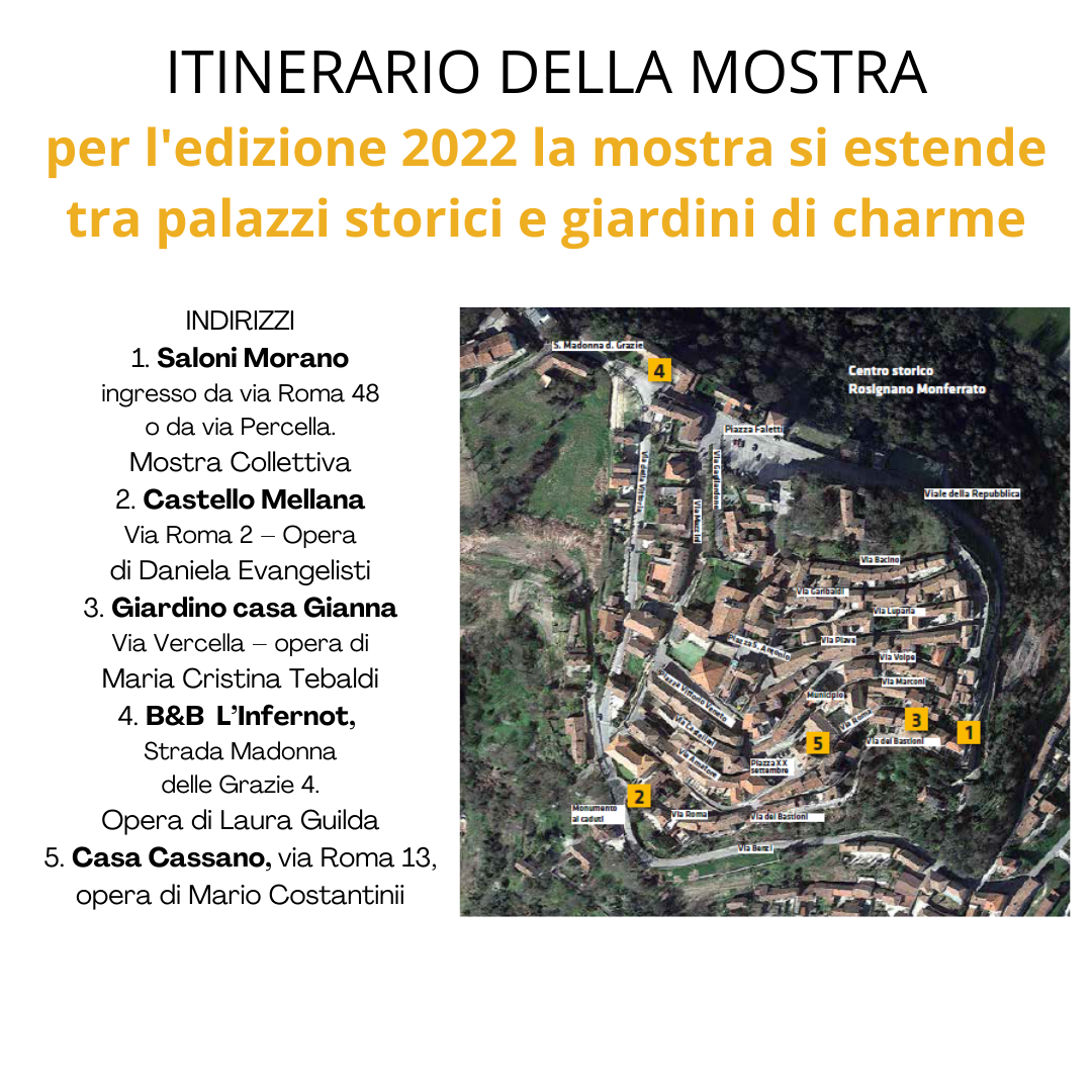 La Mostra Collettiva allestita presso i Saloni Morano è arricchita da allestimenti presso palazzi storici e giardini di charme del centro storico del borgo di Rosignano Monferrato: il Castello Mellana, il Giardino di Casa Gianna, il B&B L'Infernot, Casa Cassano (per maggiori informazioni potete scaricare il documento allegato).