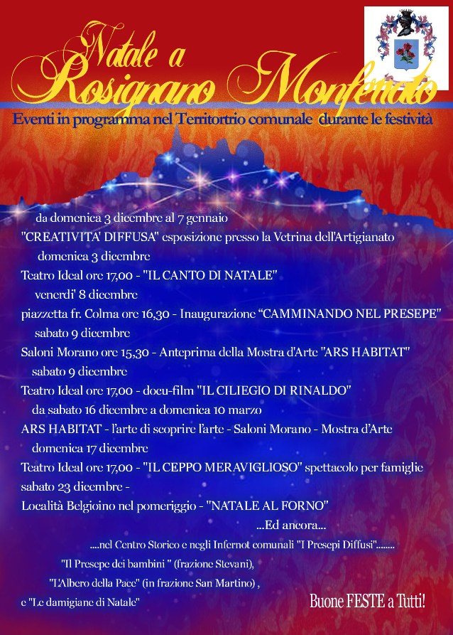 Durante tutto il periodo delle festività il territorio rosignanese sarà ravvivato dai “Presepi diffusi”, a cominciare da quelli allestiti nel centro storico del borgo di Rosignano Monferrato e negli Infernot comunali, fino al “Presepe dei bambini” in frazione Stevani. Non mancheranno anche gli addobbi natalizi tra cui “L’Albero della Pace” in frazione San Martino e le “Damigiane di Natale”, luminarie collocate lungo le strade e le vie del territorio. Prosegue la possibilità di visitare gli Infernot pubblici, la Vetrina dei Vini e della Viticoltura Rosignanese ed altri luoghi di interesse turistico, il sabato e la domenica (offerta libera, consigliata la prenotazione all’Info Point Turistico tel. 377 169 3394).