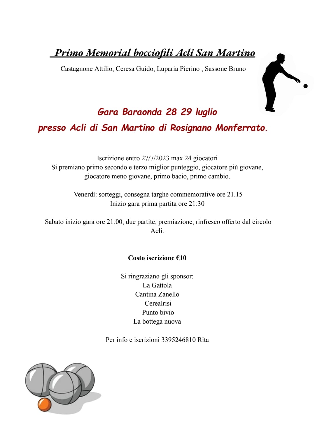 La frazione San Martino di Rosignano Monferrato ospiterà il "Primo Memorial Bocciofili Acli San Martino: Castagnone Attilio, Ceresa Guido, Luparia Pierino , Sassone Bruno". La Gara Baraonda è in programma venerdì 28 e sabato 29 luglio presso il Circolo Acli di San Martino e le iscrizioni si chiudono giovedì 27 luglio (massimo 24 giocatori).