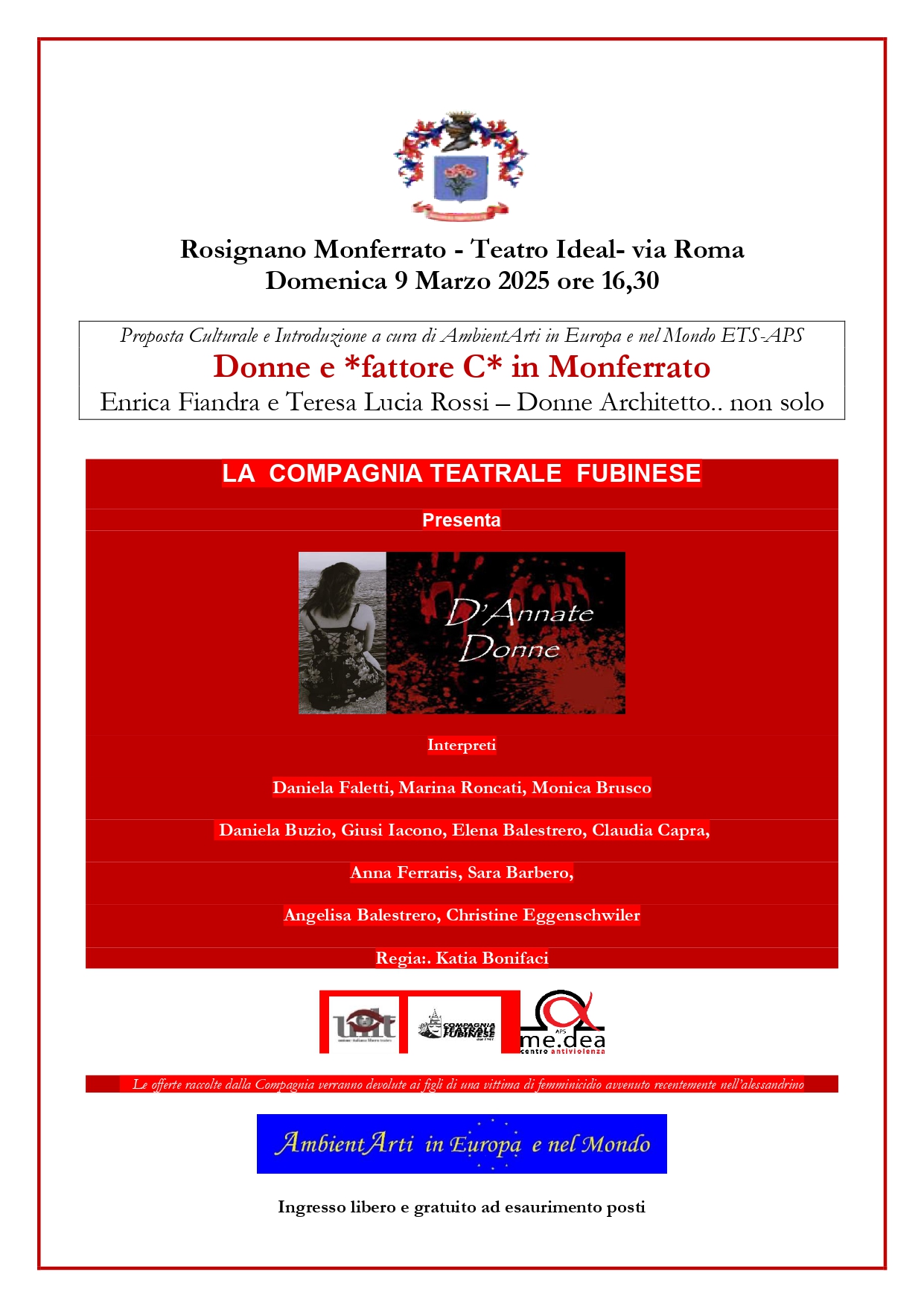 Il Teatro Ideal di Rosignano Monferrato domenica 9 marzo, alle ore 16:30, ospiterà uno Spettacolo Teatrale messo in scena dalla Compagine Femminile del Teatro di Fubine e proposto come “omaggio alle Donne” dall’Associazione di PromozioneSocio-Culturale “AmbientArti in Europa e nel Mondo” e patrocinato dal Comune di Rosignano Monferrato.