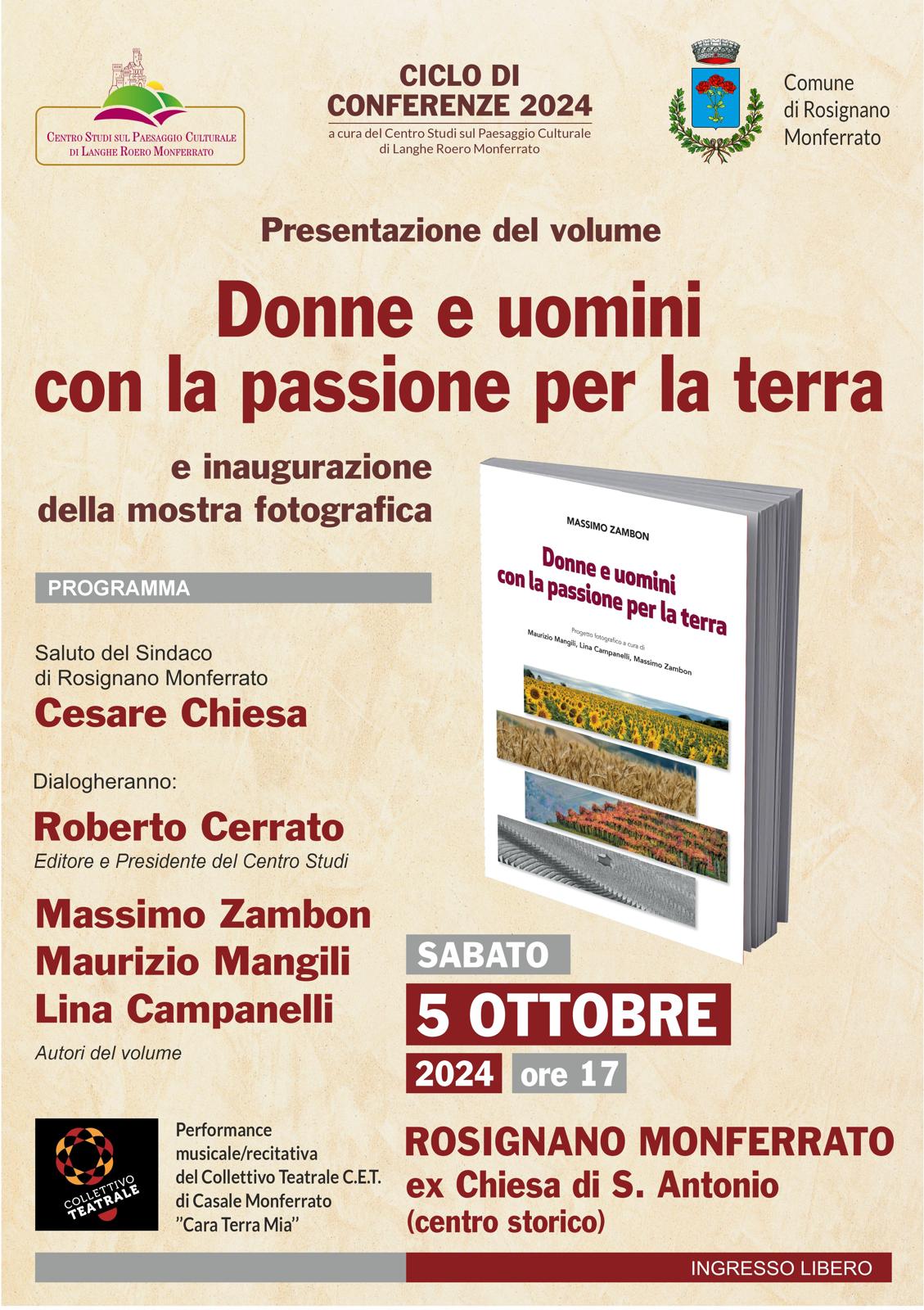 La presentazione del libro e l'inaugurazione della mostra fotografica sono in programma sabato 5 ottobre alle ore 17 presso la ex Chiesa di Sant'Antonio, nel centro storico di Rosignano Monferrato, come anteprima della manifestazione di "Vendemmia in Arte" che anima le vie e le piazze del borgo il giorno successivo, domenica 6. Dopo i saluti del Sindaco Cesare Chiesa, gli autori Massimo Zambon, Lina Campanelli e Maurizio Mangili dialogheranno con Roberto Cerrato - editore e presidente del Centro Studi sul Paesaggio Culturale di Langhe Roero e Monferrato. Durante la presentazione, seguita da un rinfresco a base di bignè al Grignolino, sarà dedicato ampio spazio alla performance musicale/recitativa del Collettivo Teatrale C.E.T. di Casale Monferrato "Cara Terra Mia", che introdurrà emozioni e sensazioni legate alla tradizione monferrina dei canti, dei modi di dire, delle tradizioni del tempo di vendemmia - un momento emozionante, vissuto in una cornice unica e con atmosfere d'altri tempi. La presentazione libraria è ad ingresso libero.