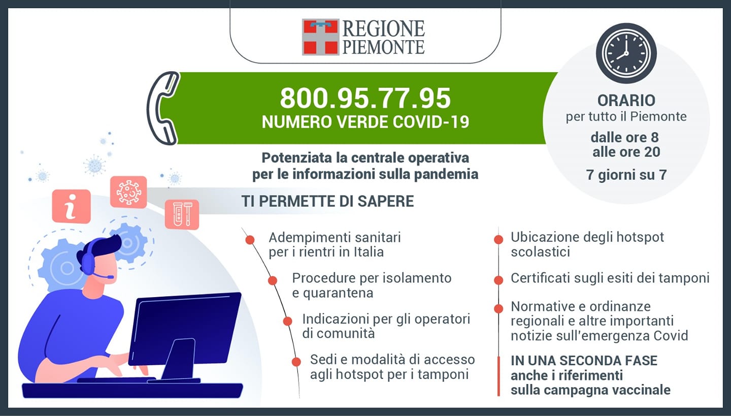 Regione Piemonte - Numero Verde Covid-19 per ottenere maggiorni informazioni sulla pandemia.