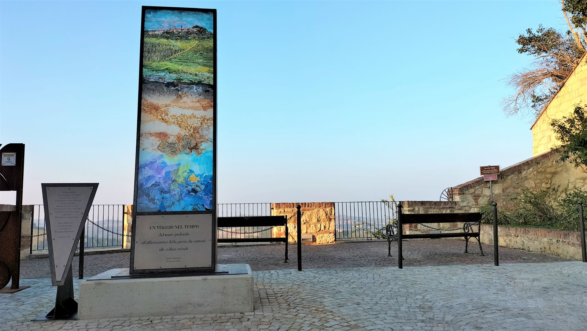 Inaugurata nel 2022, la Stele "Viaggio nel Tempo" è un'opera d'arte in vetro e corten di Lucia Caprioglio, che artisticamente rappresenta e ripercorre le ere geologiche che hanno prodotto la Rocca su cui sorge il Capoluogo.