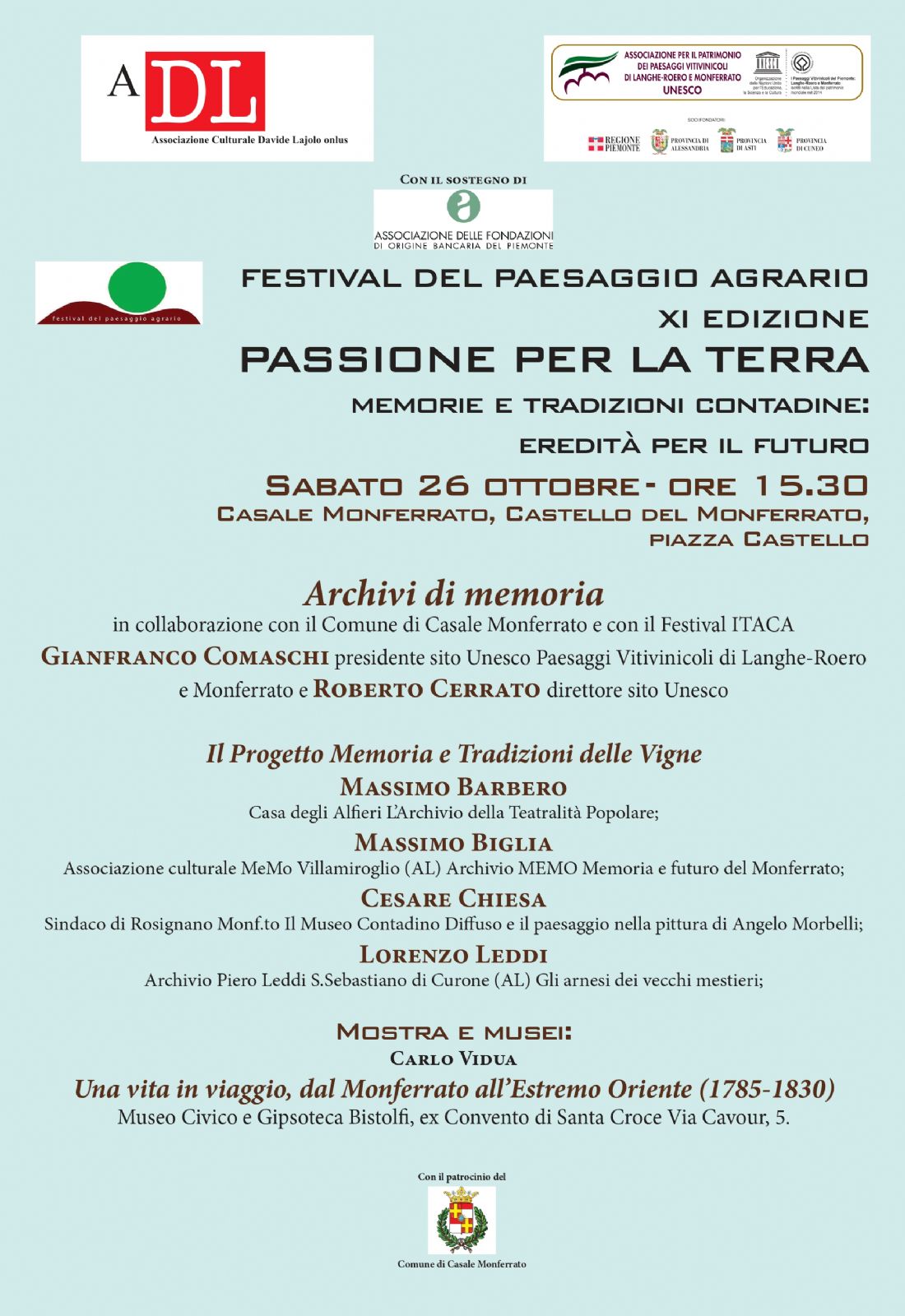 Sabato 26 ottobre il Castello di Casale Monferrato ospita il Festival del Paesaggio Agrario organizzato dall’Associazione culturale Davide Lajolo insieme al Sito UNESCO Paesaggi Vitivinicoli di Langhe-Roero e Monferrato.