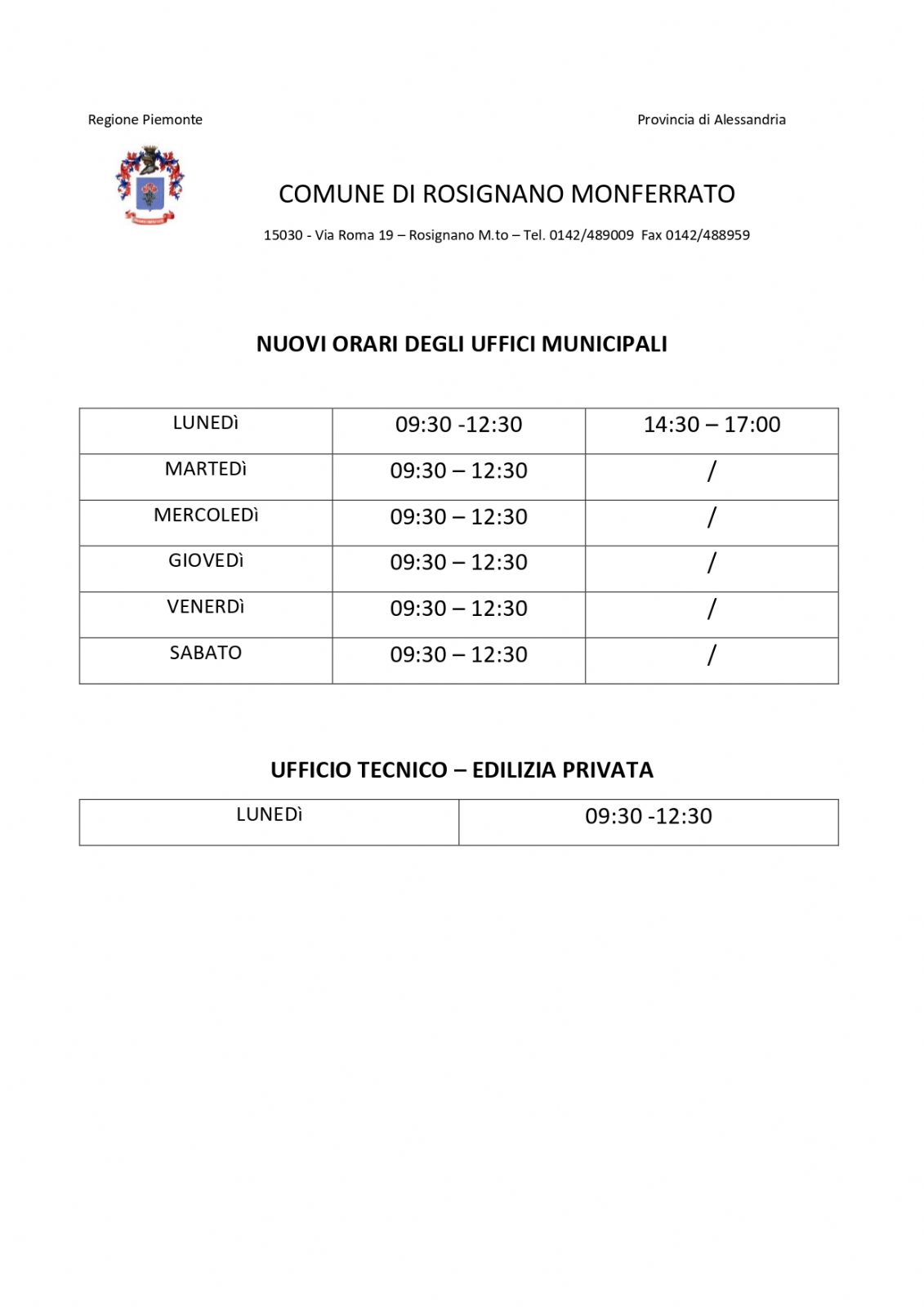 Nuovi orari degli uffici municipali, così come modificati per favorire il risparmio energetico.