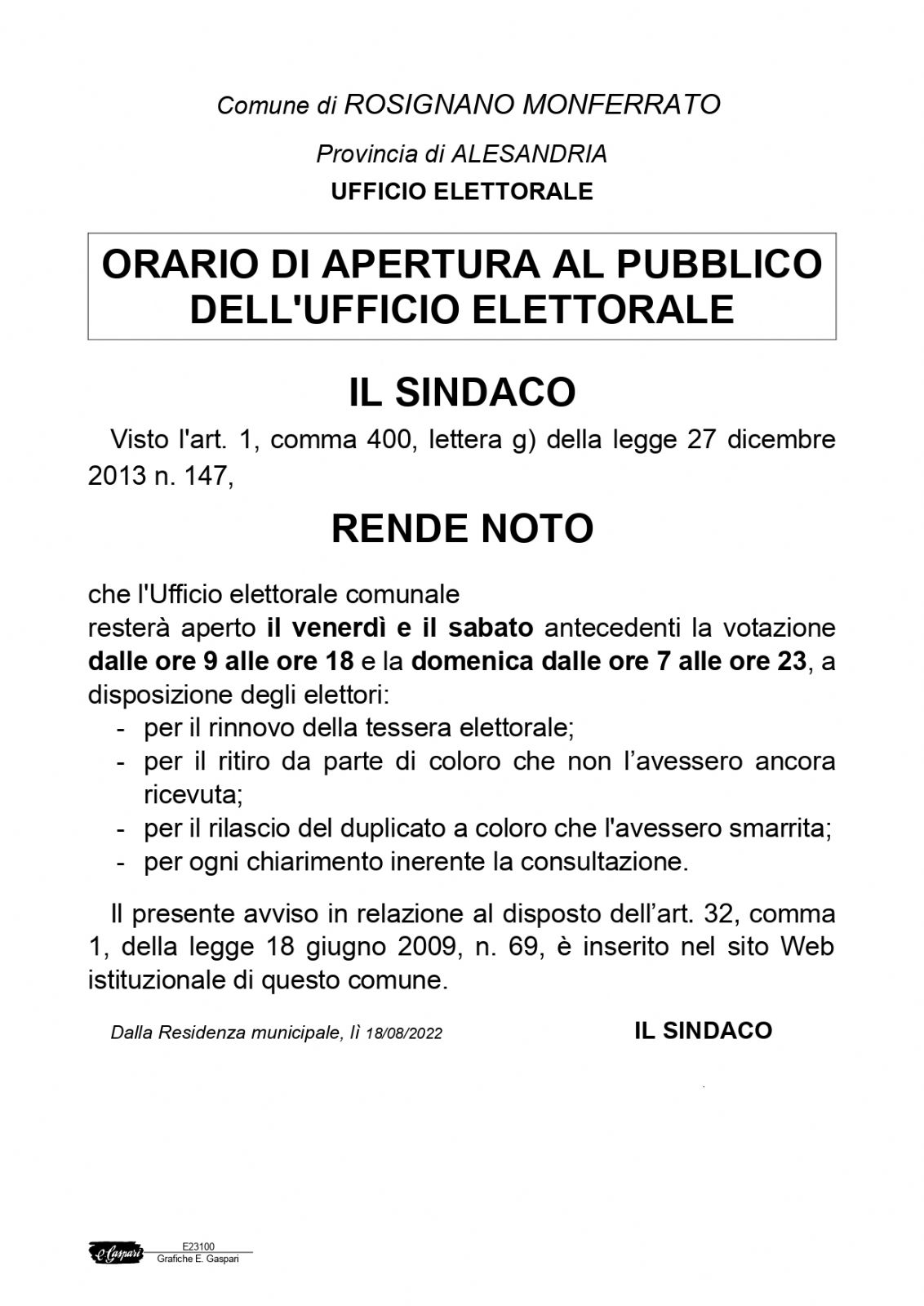 Il sindaco, visto l'art. 1, comma 400, lettera g) della legge 27 dicembre 2013 n. 147, rende noto che l'Ufficio elettorale comunale resterà aperto il venerdì e il sabato antecedenti la votazione del 25 settembre dalle ore 9 alle ore 18 e la domenica dalle ore 7 alle ore 23, a disposizione degli elettori: