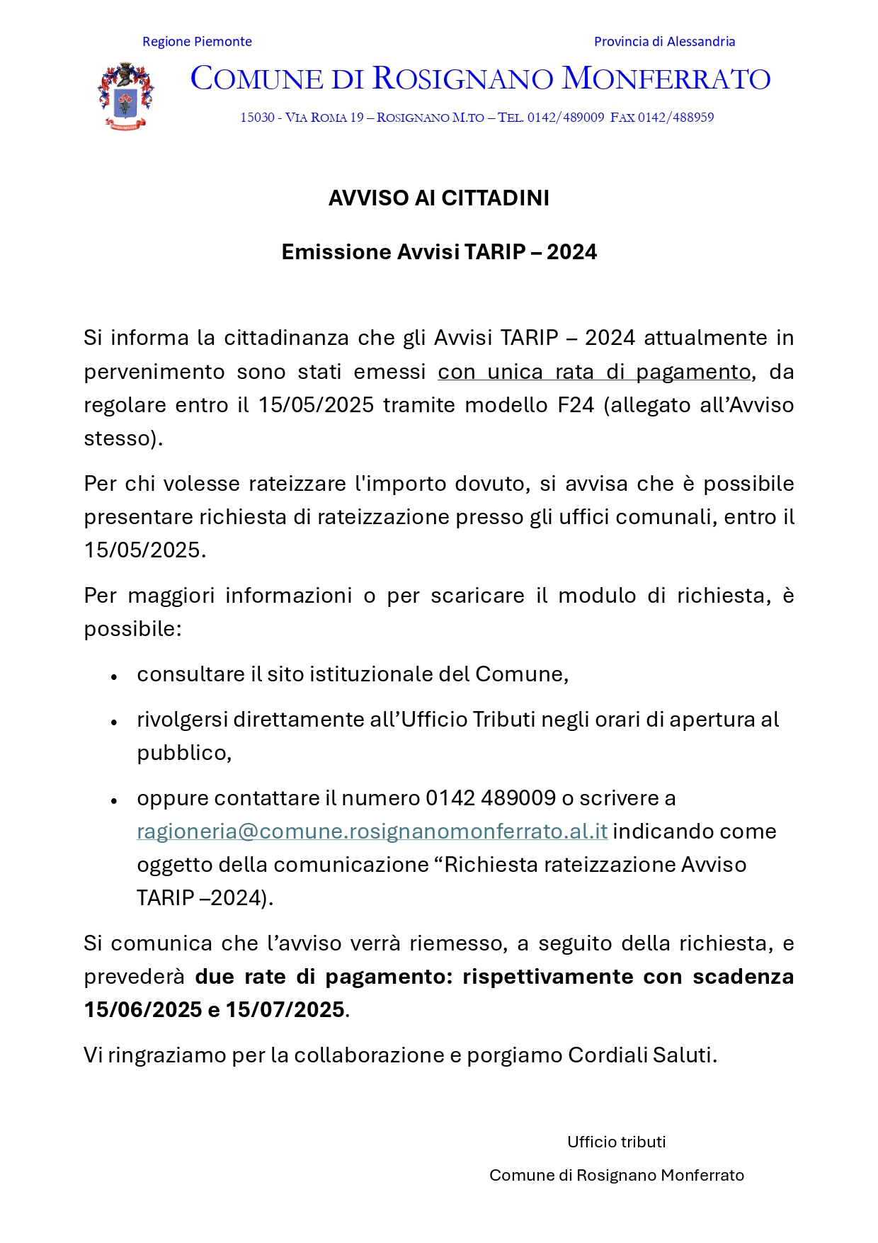 • oppure contattare il numero 0142 489009 o scrivere a ragioneria@comune.rosignanomonferrato.al.it indicando come oggetto della comunicazione “Richiesta rateizzazione Avviso TARIP –2024).