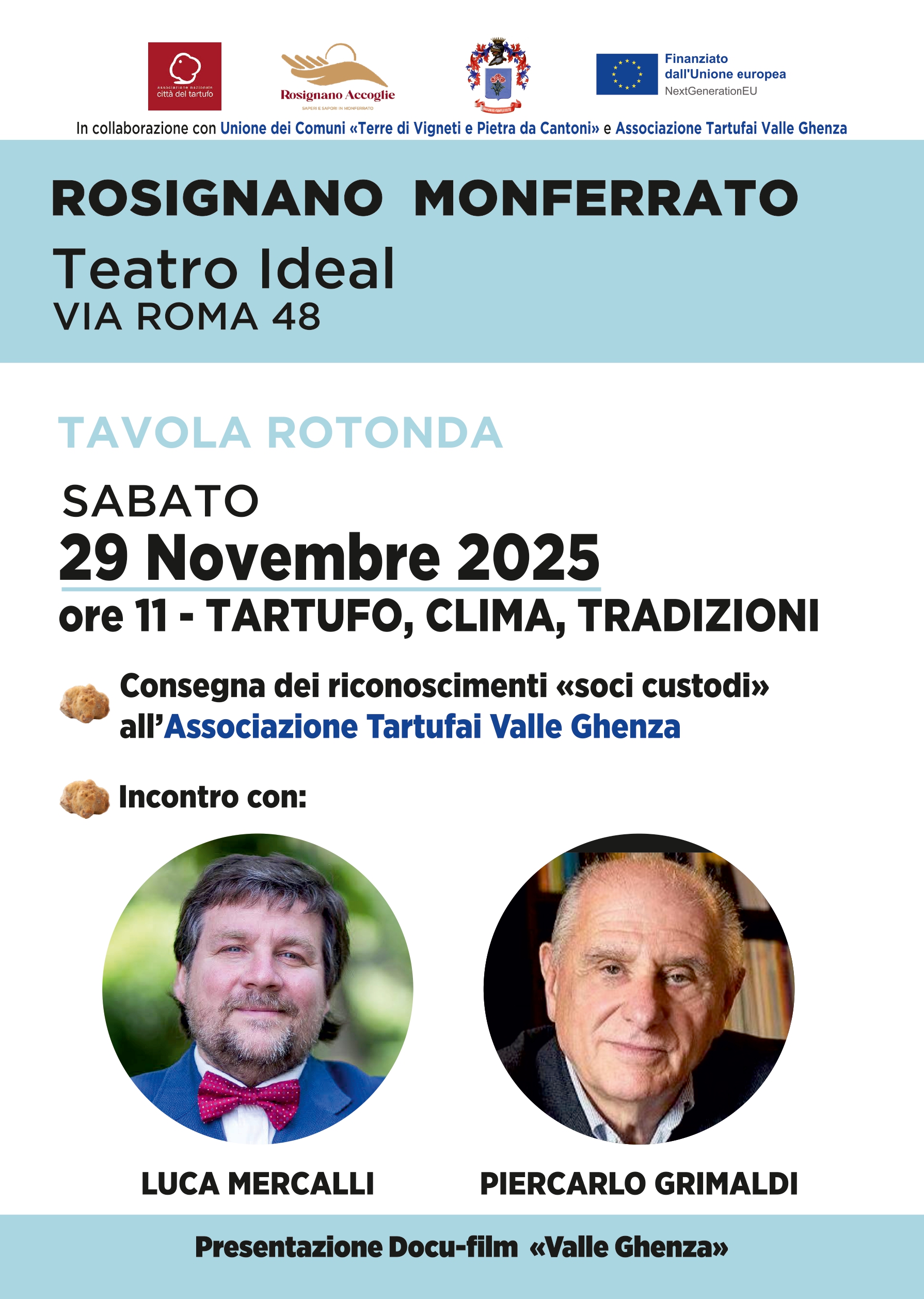 Durante l’incontro verrà consegnato il riconoscimento di “Socio custode” ai componenti dell’Associazione Tartufai Valle Ghenza e sarà presentato il progetto del film documentario “Valle Ghenza: la tartufaia naturale del Monferrato”.