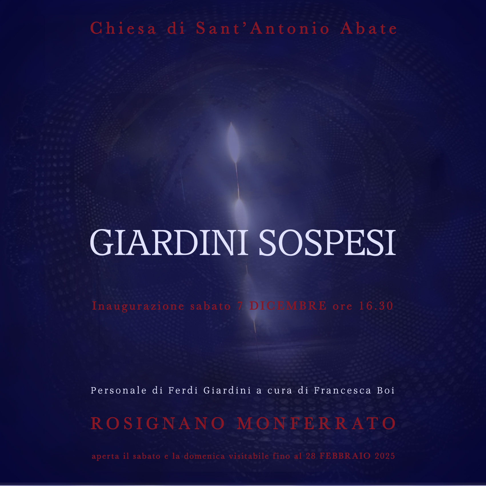 La più antica chiesa di Rosignano Monferrato sabato 7 dicembre apre i suoi portoni all’artista FERDI GIARDINI, con una mostra d’arte curata da Francesca Boi, che si inserisce pienamente nel calendario degli eventi natalizi Rosignanesi.