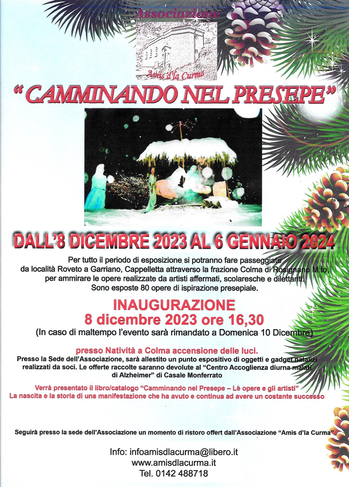 Venerdì 8 dicembre si inaugura l’allestimento di “Camminando nel Presepe”, alle ore 16:30 nella piazzetta in frazione Colma, davanti alla Natività: curato ormai da anni dall’Associazione Amis d’la Curma e visitabile fino al 6 gennaio, il percorso di opere d’arte si snoda tra le vie delle frazioni e località di Roveto, Colma, Cappelletta e Garriano, postazioni all’aperto sempre fruibili. In occasione del momento inaugurale si terrà davanti alla sede dell’Associazione il banco con i gadget natalizi realizzati da Simona Campagnola, il cui ricavato verrà devoluto al Centro diurno per malati di Alzheimer in cui opera la Dott.ssa Degiovanni. Inoltre, verrà presentato il libro "Camminando nel Presepe. Le opere e gli artisti”, la pubblicazione-catalogo delle opere presenti lungo il Percorso artistico, il cui numero si è incrementato di anno in anno, arrivando ad essere più di ottanta. Cioccolata calda e dolcetti natalizi offerti dall’Associazione ai partecipanti. In caso di maltempo, l'evento sarà rimandato a domenica 10 dicembre.