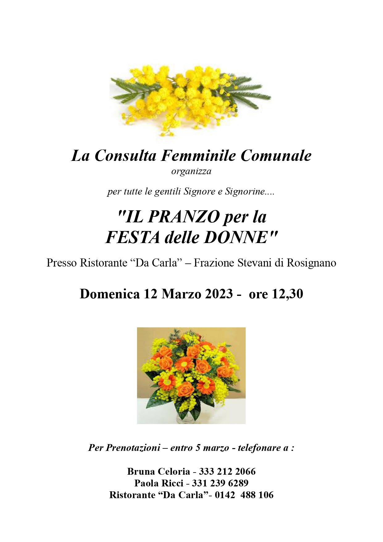 Per Prenotazioni – entro 5 marzo - telefonare a :