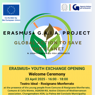siamo lieti di invitarvi all'evento di Welcome Ceremony che si terrà mercoledì 23 aprile 2025 dalle ore 16:00 alle ore 18:00 presso il Teatro Ideal - Rosignano Monferrato per accogliere i giovani ragazzi che parteciperanno dal 23 al 30 aprile al progetto GLOBAL ACTION TO SAVE THE PLANET – G.A.I.A.” project Erasmus+ 2021-2027 Program - Key Action 1 Mobility - Youth Exchange Ref N. 2024-1-IT03-KA152-YOU-000228372.
